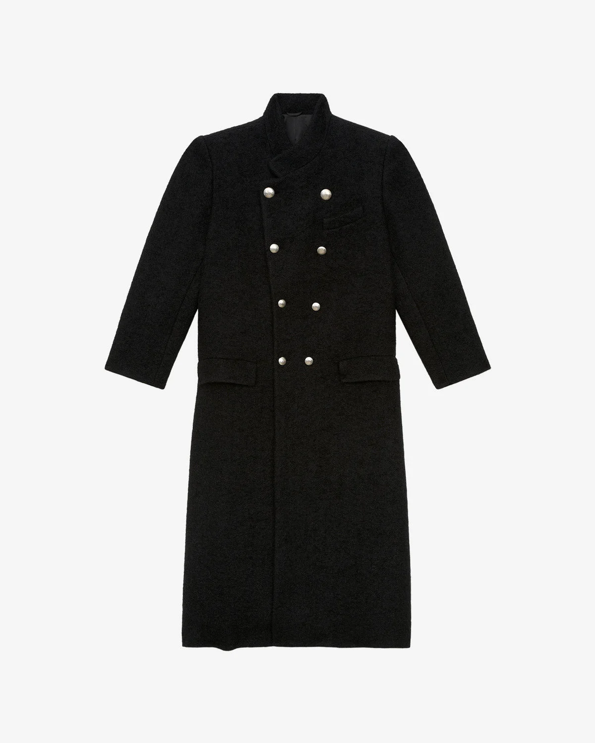 Long brushed wool blend coat Lapel Long sleeves with buttoned cuffs Chest pocket Flap pockets on the sides Inside pocket Buttoned crossover front with round hammered metal buttons Rear vent Straight cut Style: MA0481HA-C4E01H GIL 34% cotton, 16% polyester, 14% alpaca, 14% mohair, 12% wool, 10% polyamide