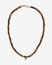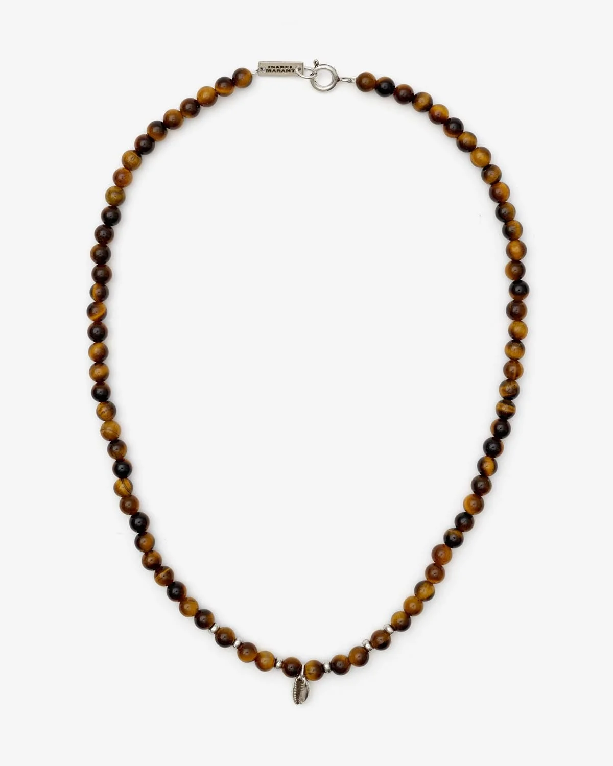 80% stone, 10% brass, 10% tin Stone bead necklace Silver shell-shaped charm on the front Spring ring clasp Length: 51 cm / 20 in.
