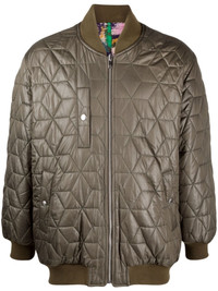 Otis reversible bomber jacket Highlights - Khaki - Wool blend - Quilted - Patterned intarsia knit - Reversible - Ribbed band collar - Long sleeves - Stud-fastening chest pocket - Two side stud-fastening pockets - Ribbed cuffs and hem Imported Composition Outer: Wool 74%, Polyester 26% Lining: Polyester 100% SIZE & FIT Model measurements Height 6 ft 2 in(1.87 m) Bust/Chest 38.18 in(97 cm) Hips 36.61 in(93 cm) Waist 29.13 in(74 cm) FittingInformation Designed to be unstructured, offering a loose fit throughout The ribbed hem offers a close, comfortable fit Made from a quilted non-stretch fabric, giving it no natural elasticity This piece fits true to size – take your usual size