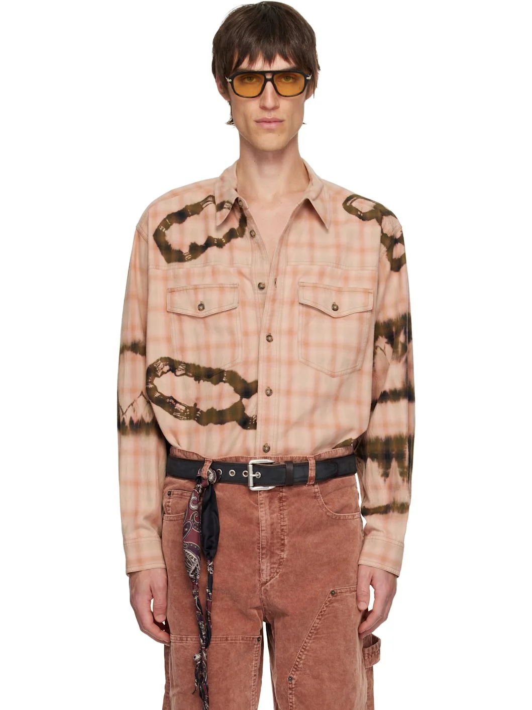 Cotton flannel shirt. · Check and tie-dye pattern throughout · Spread collar · Button closure · Flap pockets at chest · Shirttail hem · Buttoned barrel cuffs Supplier color: Faded peach 100% cotton. Made in Tunisia 252600M192009