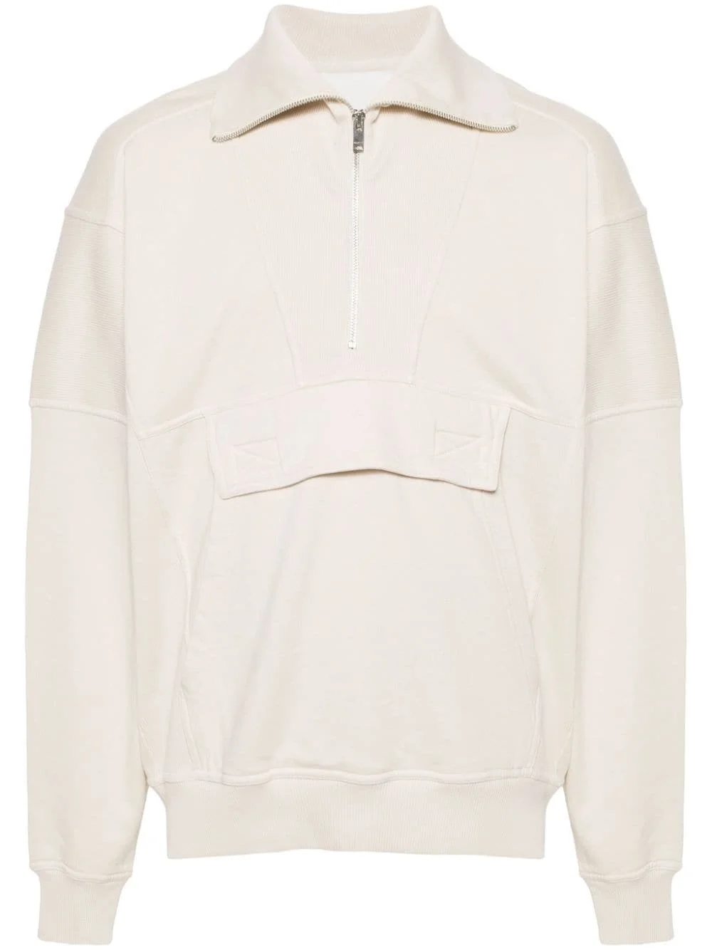 Preston cotton sweatshirt Highlights - Ecru - Cotton - Jersey texture - Ribbed panelling - Funnel neck - Drop shoulder - Long sleeves - Ribbed cuffs and hem - Front pouch pocket - Fleece lining - Straight hem - Short front zip fastening Imported Composition Cotton 100% SIZE & FIT Model measurements Height 6 ft 2 in(1.87 m) Bust/Chest 33.46 in(85 cm) Hips 36.22 in(92 cm) Waist 29.52 in(75 cm) FittingInformation Designed to be unstructured, offering a loose fit throughout Made from a midweight non-stretch fabric, this piece offers minimal elasticity when worn This piece fits true to size – take your usual size