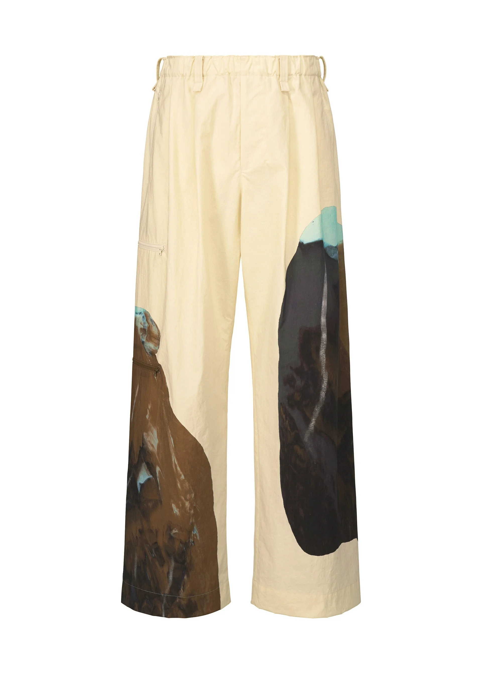 These pants evoke the texture of stone with their print of a pattern that expresses the intricate layered beauty of the outside and inside of stones on taut nylon fabric. Inspired by the natural beauty of stone, they are characterized by their pattern created through the accidental mixing of paint. They have pockets on the front and back as well as both sides, and belt loops at the waist. They have a zipper-fly design. The pattern of this product varies from item to item. Please note this in advance. Product Information Material: 100% nylon Made in Japan Waist Specifications:Elastic / Belt Loop Front Opening:Zip Fly Pocket (Position):Front And Back Sides