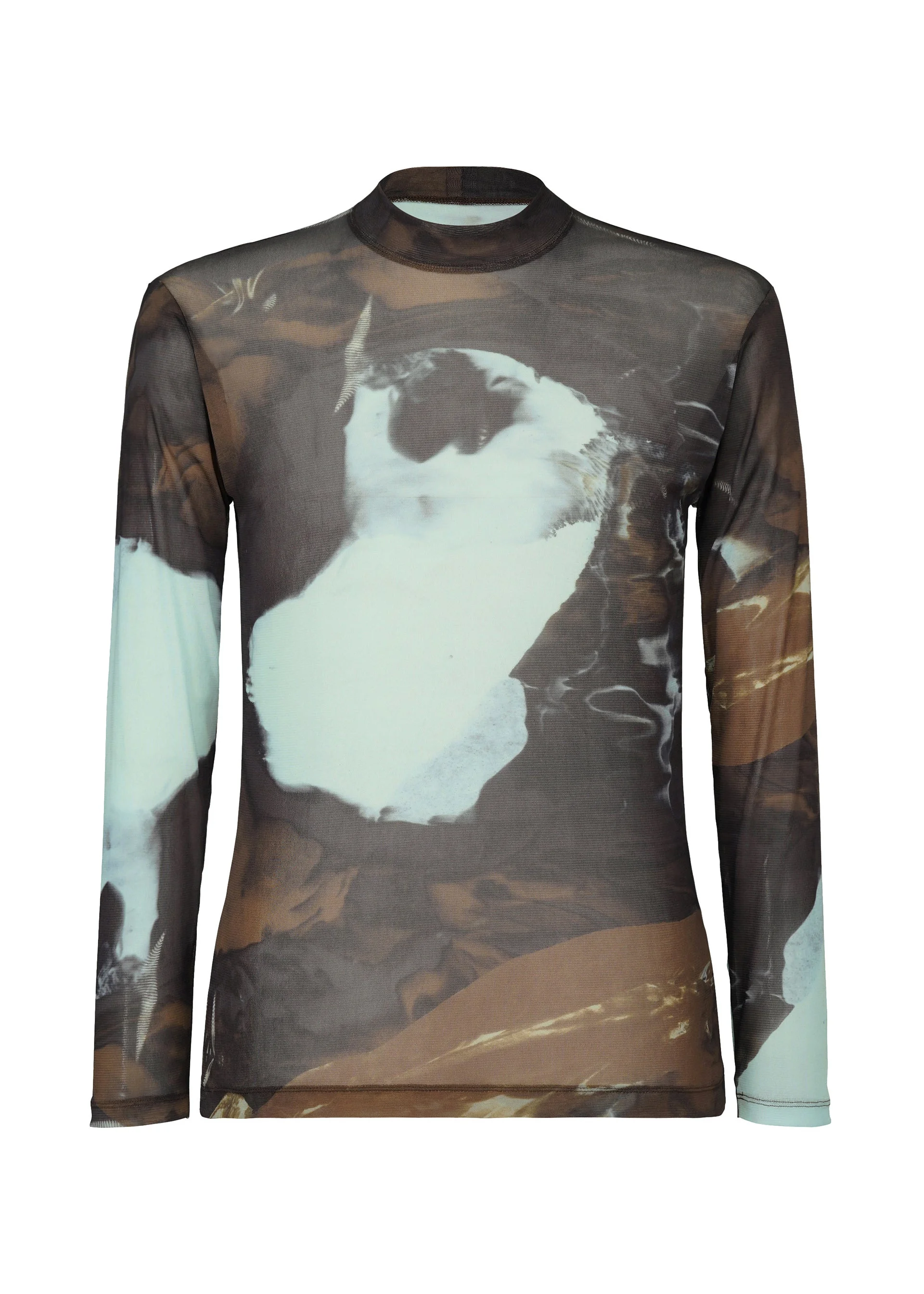 This mock-neck, long-sleeved top is made from sheer nylon fabric with a gorgeous print. The design creates a sense of unity between the material and the pattern, making it suit other fabrics and allowing it to be worn as an inner layer. Product Information Material: 100% nylon Made in Japan Neckline / Collar:Mock Neck
