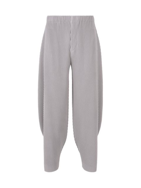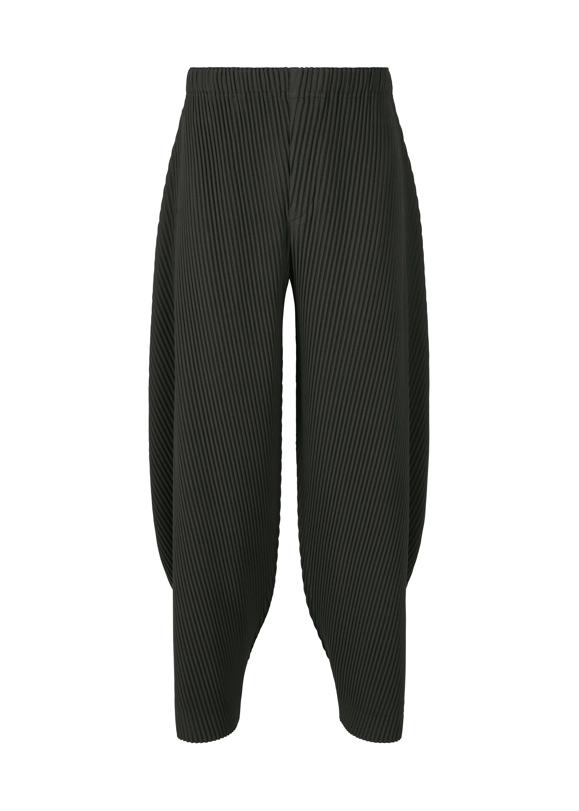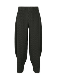These pants are inspired by the silhouette of stones shaped by the forces of nature. Diagonal pleats are applied to contrast the hard form of stone, resulting in a soft silhouette. The silhouette of the pants greatly changes depending on whether the waist and hem buttons are fastened or unfastened, allowing you to enjoy a variety of styles. They have pockets on both sides and a draw cord at the waist. They have a button-fly design. Product Information Material: 100% polyester Made in the Philippines Waist specifications:Elastic / Drawcord Front opening specification:Button fly Pocket (position):Both sides others:Buttons (waist/hem)