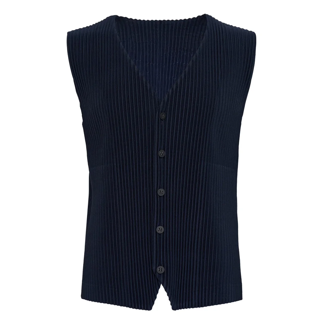 600069208NVY002 / HP59JE511/00/75 - Signature permanent pleated construction - Button-front closure with five buttons - Ribbed crew neckline - Sleeveless design - Lightweight pleated fabric - Slim fit - Machine washable HOMME PLISSE ISSEY MIYAKE Basics Vest delivers signature pleated innovation with sleeveless versatility. Crafted from the brand's revolutionary pleated fabric in sophisticated navy, featuring the iconic permanent pleat construction that retains its shape. The minimalist button-front design and ribbed neckline showcase Japanese technical craftsmanship at its finest.