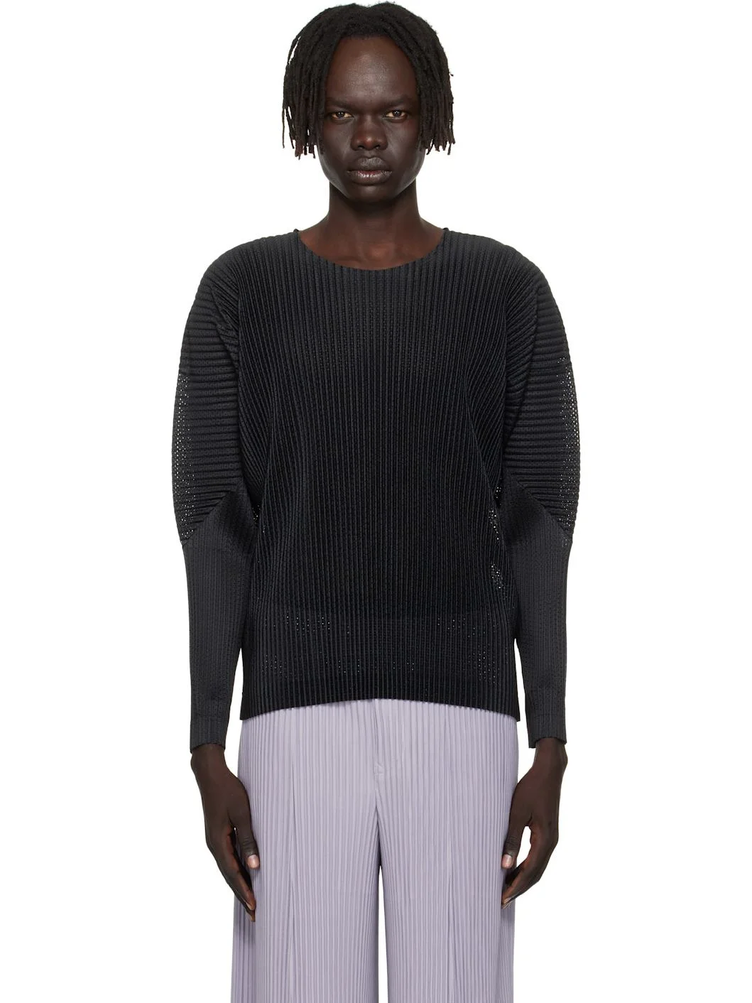 Garment-pleated tricot T-shirt. · Perforations throughout · Quick-drying · Round neck · Dolman sleeves Supplier color: Black 100% polyester. Made in Japan 252729M213000
