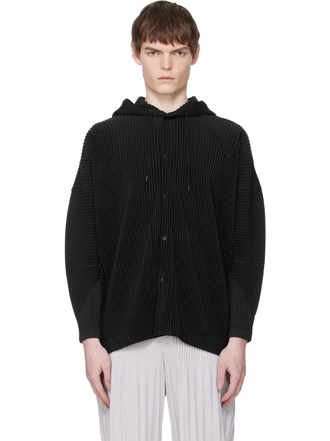 Garment-pleated tricot hoodie. · Drawstring at hood · Press-stud closure · Welt pockets at front · Dropped shoulders Supplier color: Black 100% polyester. Made in Japan 261729M202009
