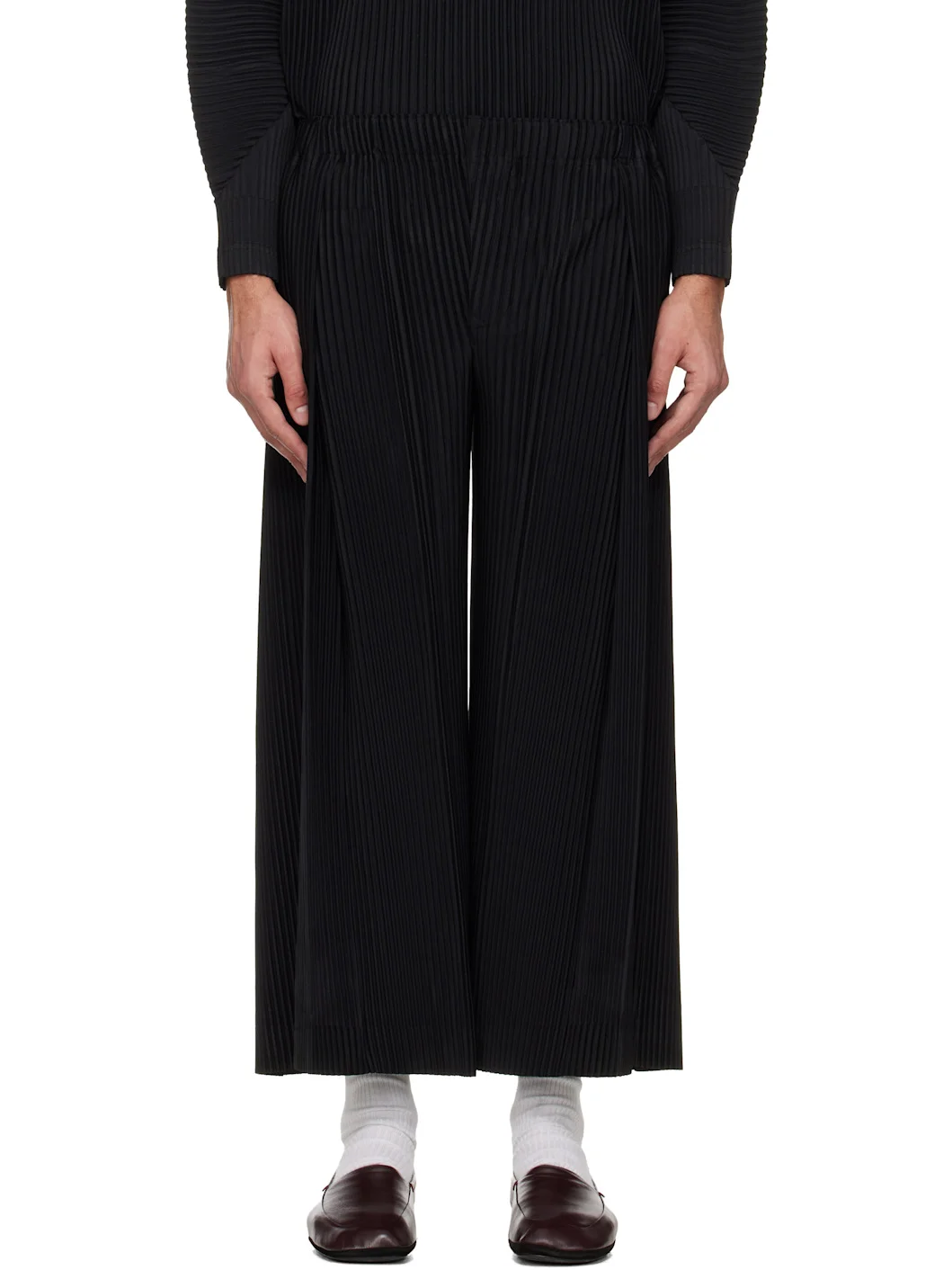 Garment-pleated tricot trousers. · Wide-leg · Concealed drawstring at elasticized waistband · Two-pocket styling · Button fly · Pleats at front and back · Creased legs Supplier color: Black 100% polyester. Made in Japan 261729M191004