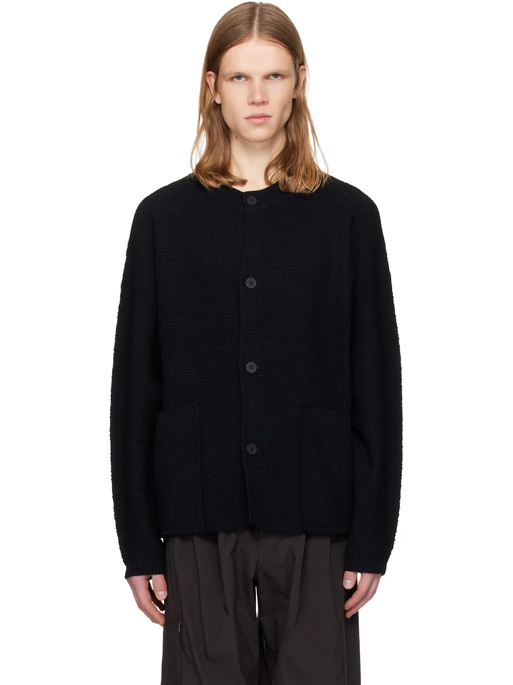 Knit wool-blend cardigan. · Rib-knit crewneck and cuffs · Button closure · Patch pockets at waist · Dropped shoulders Supplier color: Black 50% wool, 50% nylon. Made in Japan 252729M200008