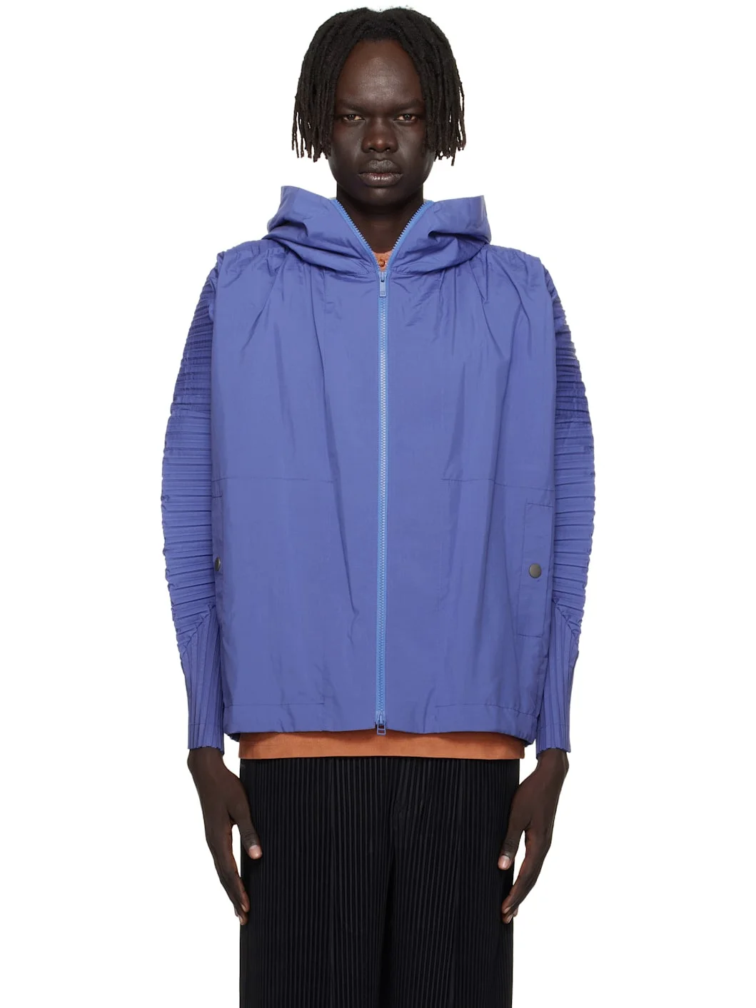 Lightweight ripstop jacket. · Pleats at hood, dolman sleeves, and back · Stand collar · Zip closure · Welt pockets · Concealed bungee-style drawstring at hem · Unlined Supplier color: Blue 100% polyester. Made in Philippines 252729M180003