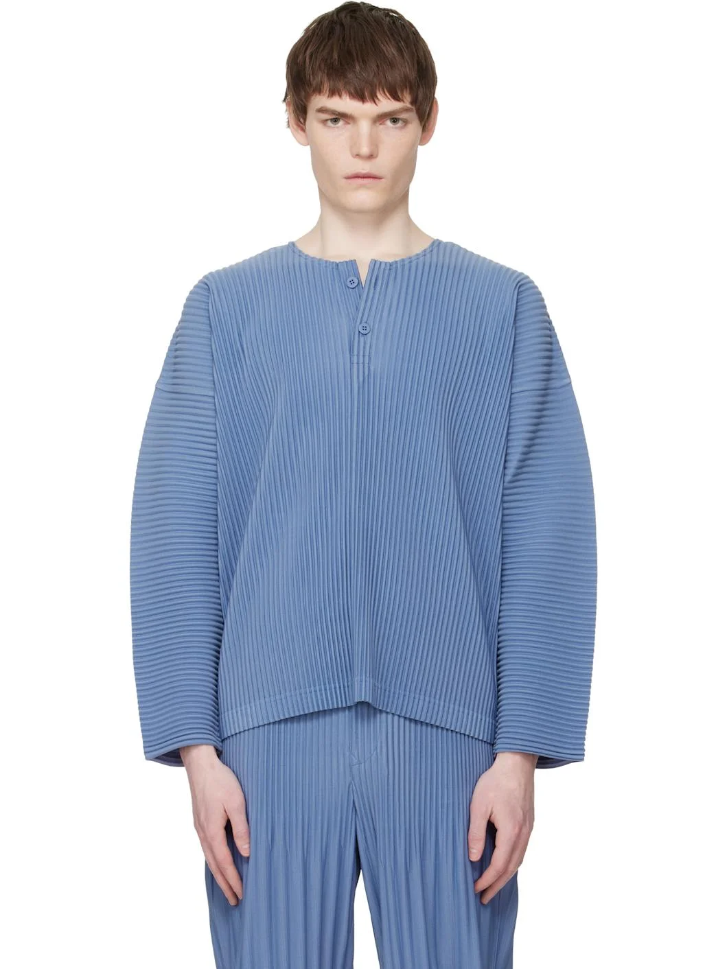 Garment-pleated tricot henley. · Crewneck · Two-button placket · Dropped shoulders Supplier color: Manarola wall violet 100% polyester. Made in Japan 261729M211000