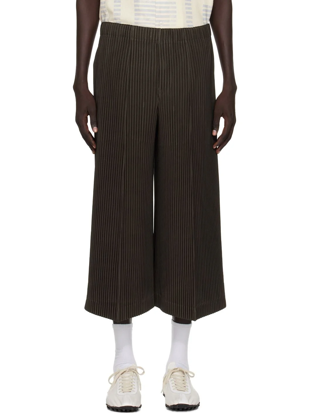 Garment-pleated tricot trousers. · Quick-drying · Concealed drawstring at elasticized waistband · Two-pocket styling · Button fly · Crease at front and back legs · Cropped leg · Vent at back cuffs Supplier color: Mud brown 100% polyester. Made in Japan 252729M191012