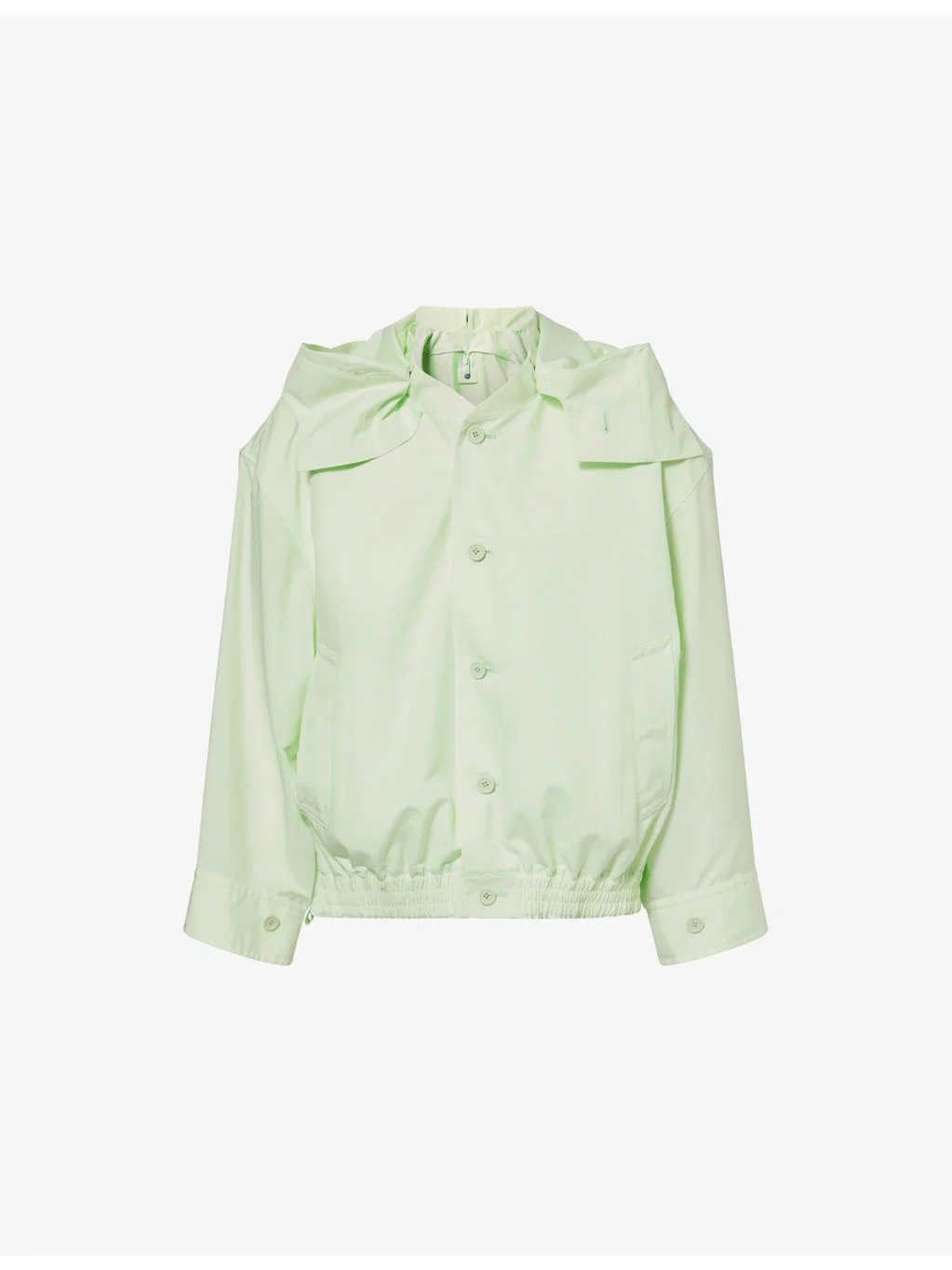 PRODUCT DETAILS - HOMME PLISSE ISSEY MIYAKE woven jacket - 100% polyester - Button, hook-and-eye and zip-fly fastening - Relaxed fit, button-front, high collar, hood and front pockets, can be folded and secured with a zip and snap-buttons, transforms from a garment bag into outerwear, water-repellent finish, back side webbing straps, brand logo at back - Machine wash mild - Size 2: length 26in / 66cm, chest 59in / 149.8cm - Model is 6ft 2in/1.88m and wears a size 2 - Lightweight, non-stretch - This garment’s sizing is based on height and doesn’t conform to standard sizes. Please refer to the size guide for your desired length. Ref: R04588762