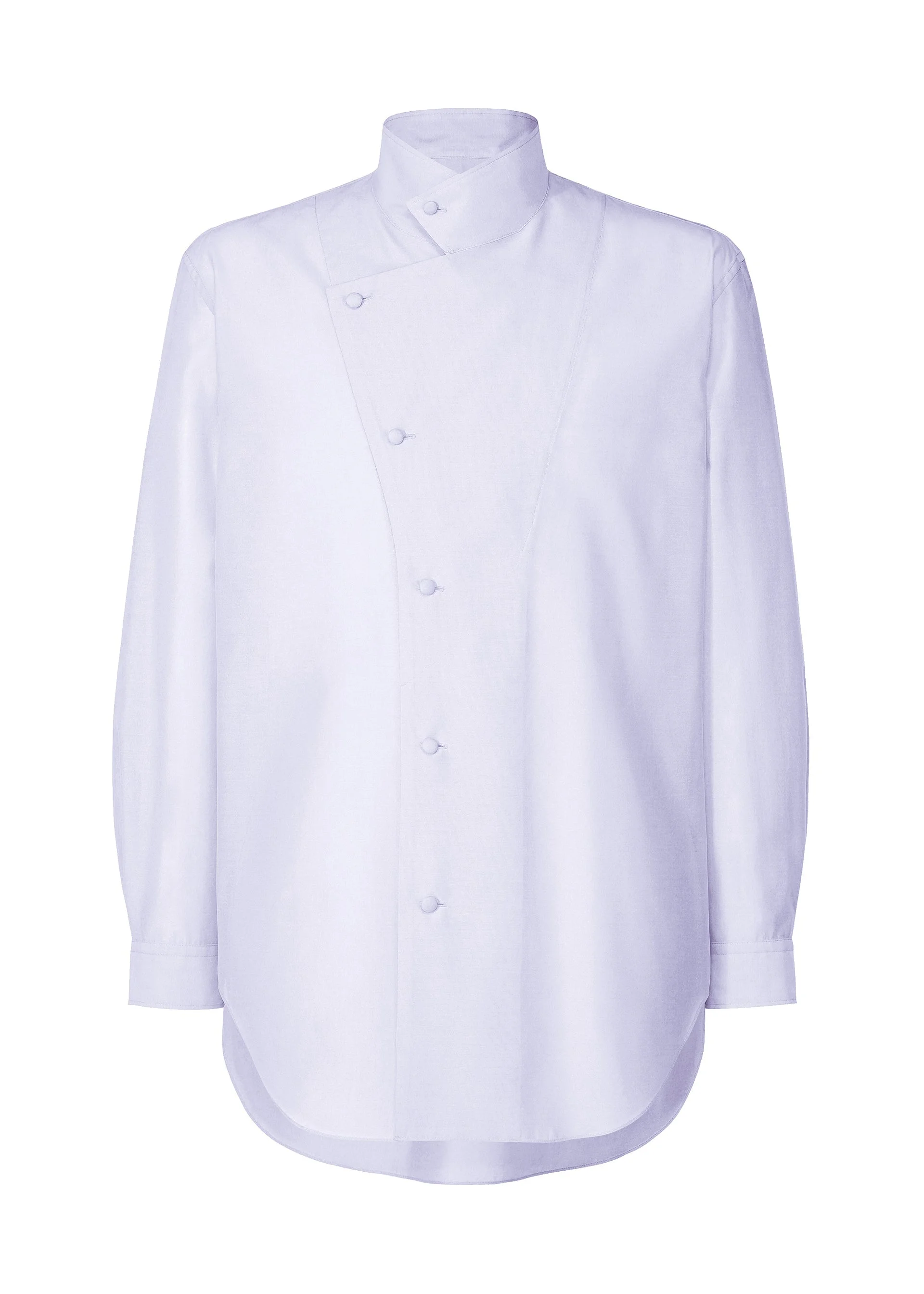 This high-neck shirt is made with a wool blend that uses split fibers, giving it a glass-like translucence and a subtle sheen. It is finished with a supple texture by adding softness and a flowy feel to the natural delicacy of wool. It is recommended as an inner layer under a jacket or in layered outfits that make use of its sheer look. Product Information Material: 92% Polyester, 8% Wool Made In The Philippines Neckline / collar:High neck Front opening:Button
