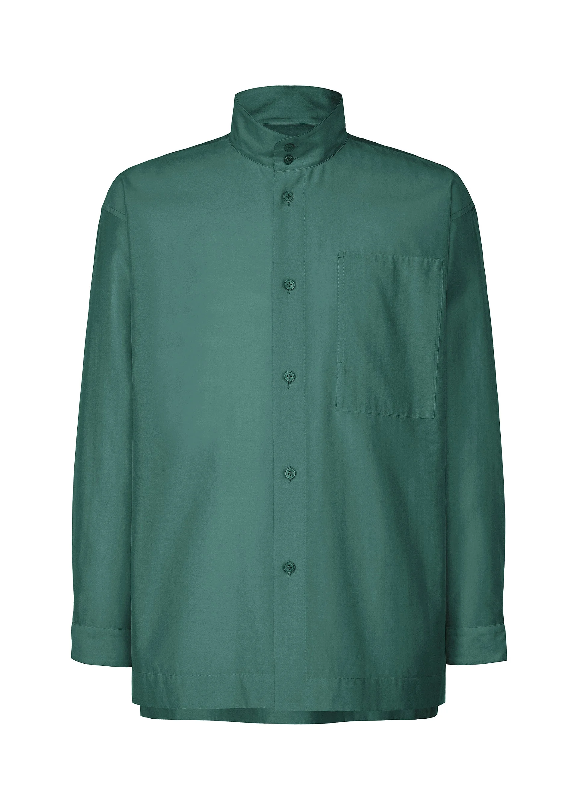 This shirt with a standing collar is made with a wool blend that uses split fibers, giving it a glass-like translucence and a subtle sheen. It is finished with a supple texture by adding softness and a flowy feel to the natural delicacy of wool. It is recommended as an inner layer under a jacket or in layered outfits that make use of its sheer look. There is a pocket on the left chest and slits on both sides. Product Information Material: 92% Polyester, 8% Wool Made In The Philippines Neckline / collar:Stand collar Front opening:Button Pocket (position):Left chest Slit (position):Both sides