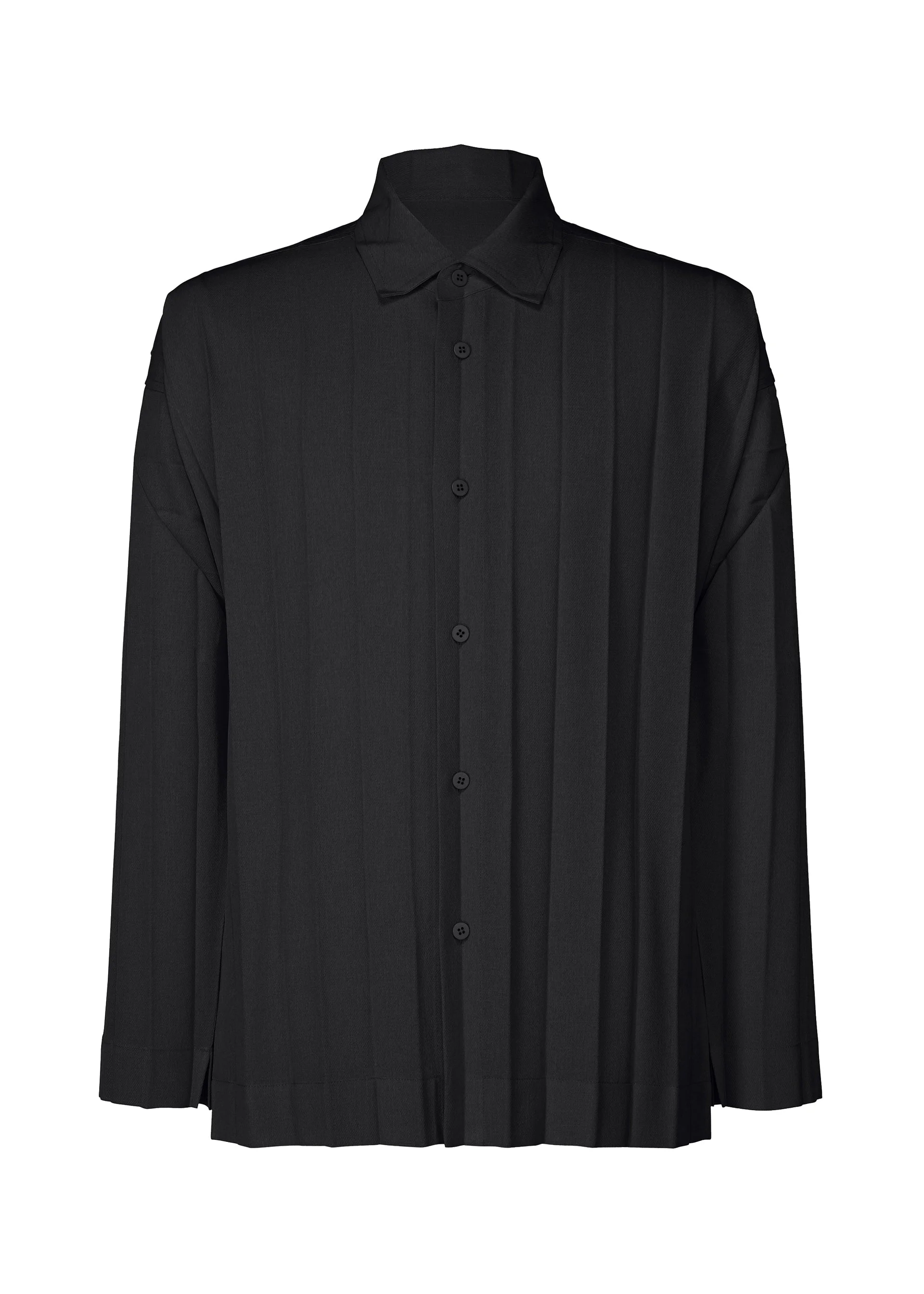 This shirt with a regular collar features wide accordion pleats applied to a moderately lustrous material. The ribbed cloth is made of recycled polyester, giving it a feel that is moderately dry to the touch, as well as a casual impression despite the classic design. There are slits on both sides. Product Information Material: 100% Polyester Made In The Philippines Neckline / collar:Regular color Front opening:Button Slit (position):Both sides