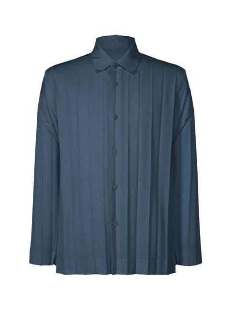 This shirt with a regular collar features wide accordion pleats applied to a moderately lustrous material. The ribbed cloth is made of recycled polyester, giving it a feel that is moderately dry to the touch, as well as a casual impression despite the classic design. There are slits on both sides. Product Information Material: 100% Polyester Made In The Philippines Neckline / collar:Regular color Front opening:Button Slit (position):Both sides