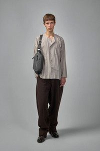 Shirt featuring pressed vertical pleats, a full button-front and a round band collar. Relaxed long-sleeve silhouette with a left chest patch pocket and straight hem with subtle side slits. Materials: 100% polyester Color: gray SKU: 152759 Brand style: HP58FJ356