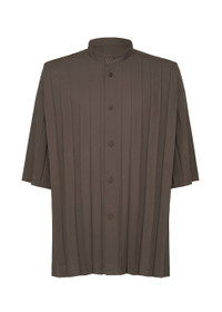 This shirt with a standing collar is made from thin polyester fabric with a hand-pleated finish. There are slits on both sides.