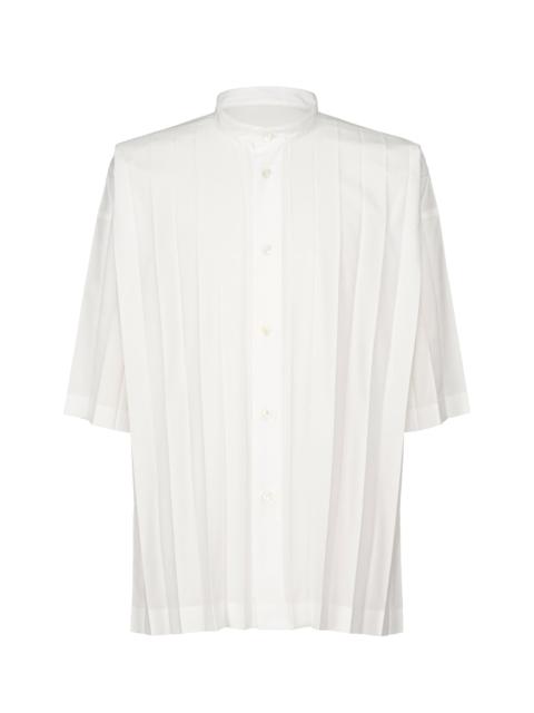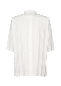This shirt with a standing collar is made from thin polyester fabric with a hand-pleated finish. There are slits on both sides.