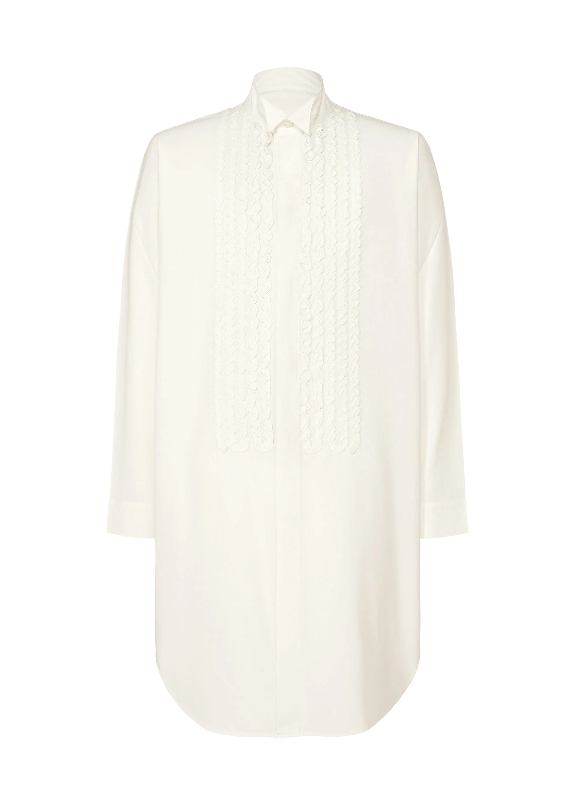 This shirt with a wing collar is characterized by its finish, in which the fabric and embroidery appear integrated. After the embroidery is applied, the entire garment is pressed, creating a curious look in which the shaded embroidery motifs seem to move between flat and dimensional forms. The design is recommended for formal occasions, as it has a sleek texture and is easy to care for. Product Information Material: 100% Polyester Made In Japan Neckline / collar:Wing collar Front opening:Double-breasted button