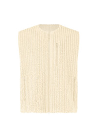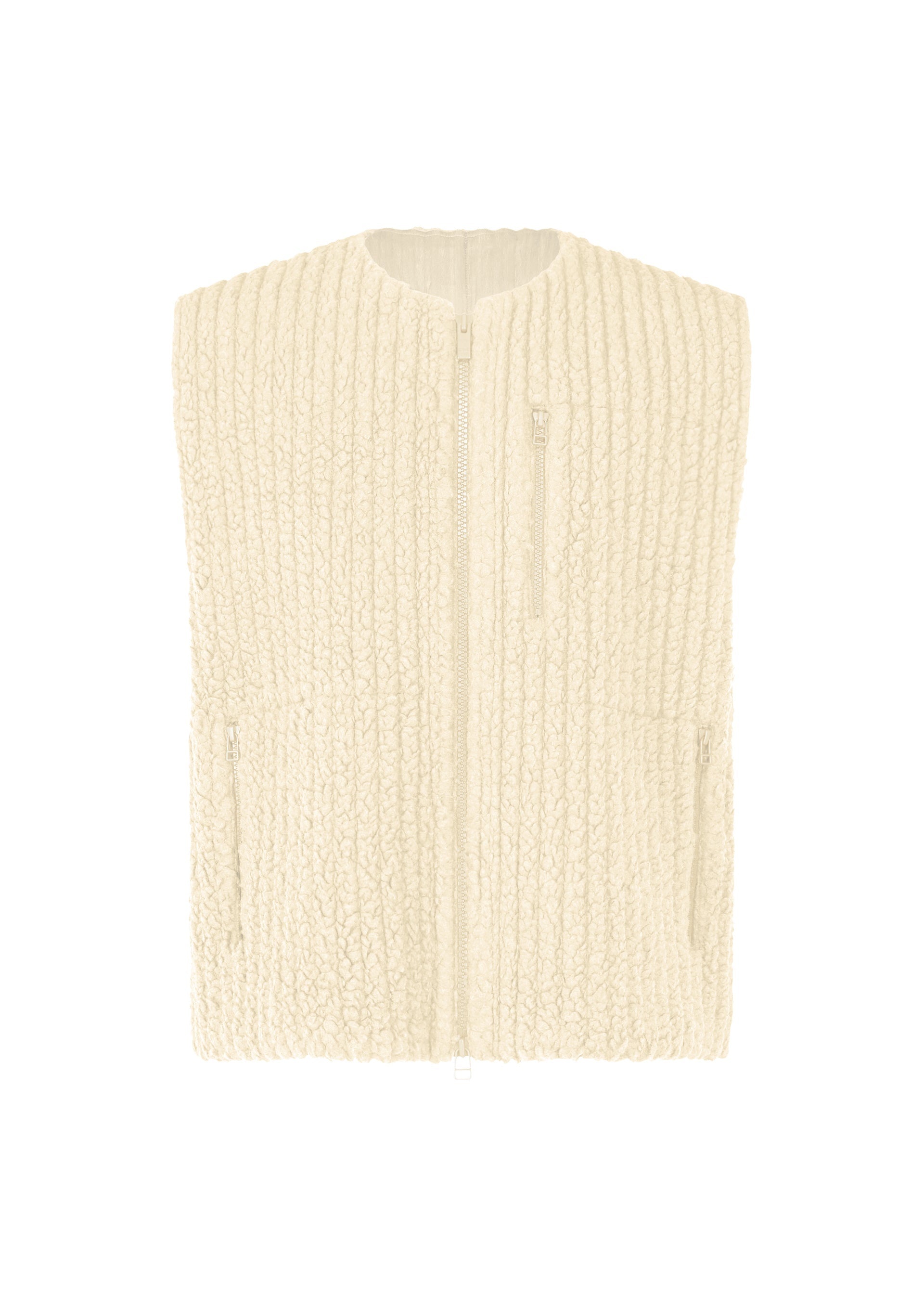 This zip-up vest is made from long-pile, sheep's wool-like fleece with a pleated finish. The material contains wool for excellent insulation. It has pockets on both sides and a left chest pocket.