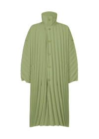 This long coat is made from highly-dense woven polyester material with a hand-pleated finish. It is characterized by its curved pleat lines, evoking a sense of the flow of wind. It has pockets on both sides and a center vent on the back. Product Information Material: 100% Polyester Country Of Origin: Philippines Neckline/Collar:High Neck Front Opening:Button Pocket (Position):Both Sides Vent (Position):Center Vent Other:Collar Hanging