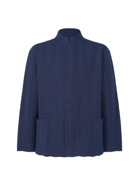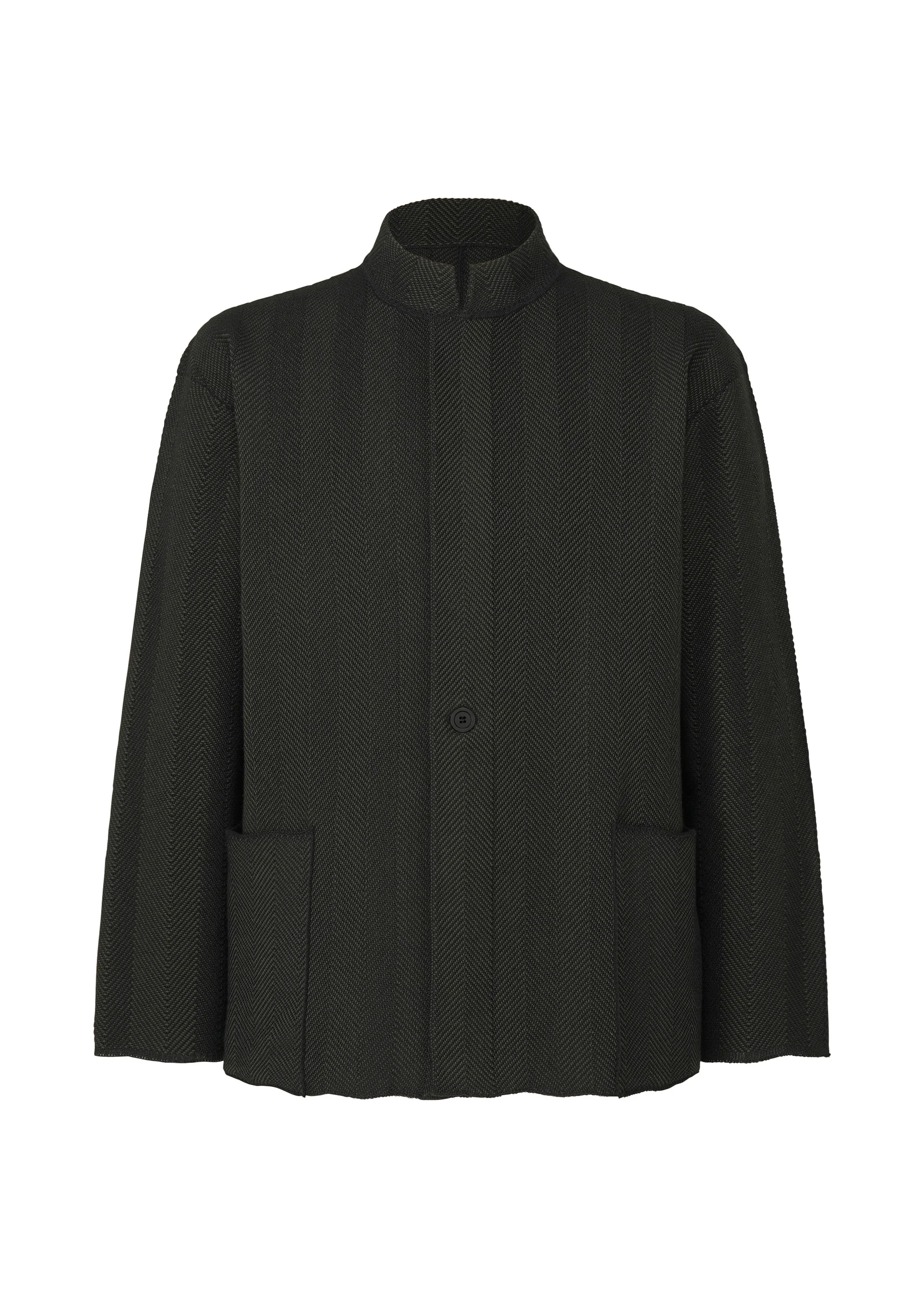 This knit jacket features an expressive look with its herringbone-style knit pattern that emerges with a three-dimensional feel. With its lightweight yet structured design, it is also recommended to be worn as part of a two-piece outfit. The fine knitwork creates shadowing and a subdued sheen that add depth to the look of the fabric. There are pockets on both sides and a center vent at the back. Product Information Material: 100% Polyester Made In Japan Neckline / collar:High neck Front opening:Button Pocket (position):Both sides Vent (location):Center vent