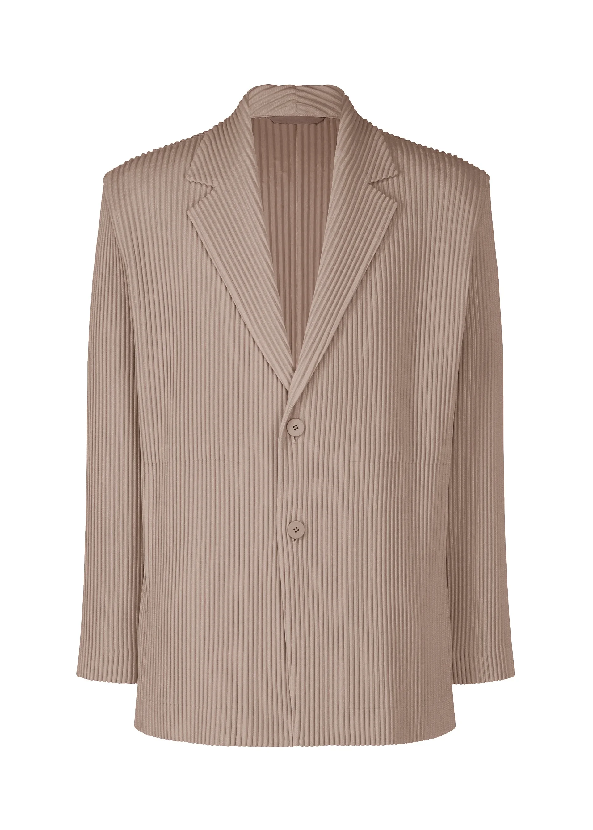 This tailored jacket is made from kersey (twill)-like material with three-dimensional ribbing that looks diagonal. It is characterized by the light comfort unique to polyester despite its wool-like fluffiness. The design features a relaxed silhouette that even pairs well with thick inner garments. It has pockets on both sides, inner pockets, and a center vent in the back. Product Information Material: 100% Polyester, Lining: 100% Polyester Made in the Philippines Neckline / Collar:Tailored collar Front opening:button Pocket (position):Both sides Vent (location):Center vent others:Inner pockets (both chests) Collar strap