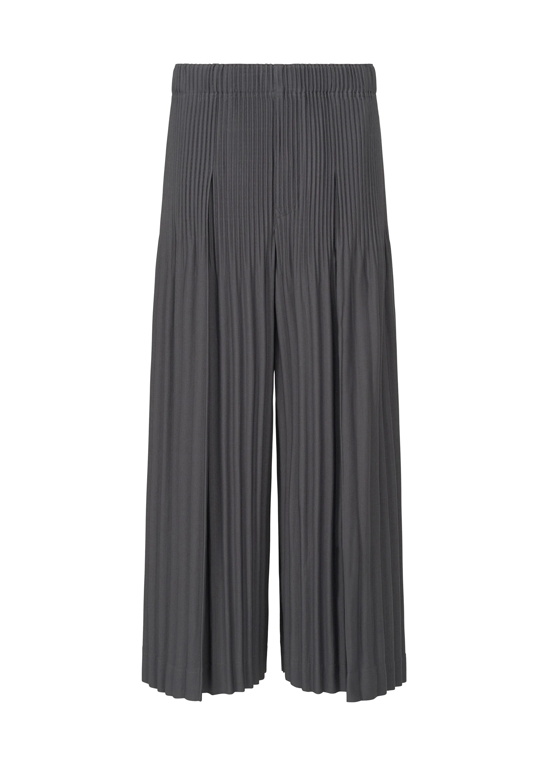 These wide pants available in gentle color tones feature Keshi pleats processing. They are characterized by their portability and light comfort with the unique quick-drying property of polyester material. The relaxed silhouette is reminiscent of Japanese hakama pants. They have pockets on both sides and a draw cord at the waist. They have a button-fly design. Product Information Material: 100% polyester Made in Japan Waist specifications:Elastic / Drawcord Front opening specification:Button fly Pocket (position):Both sides