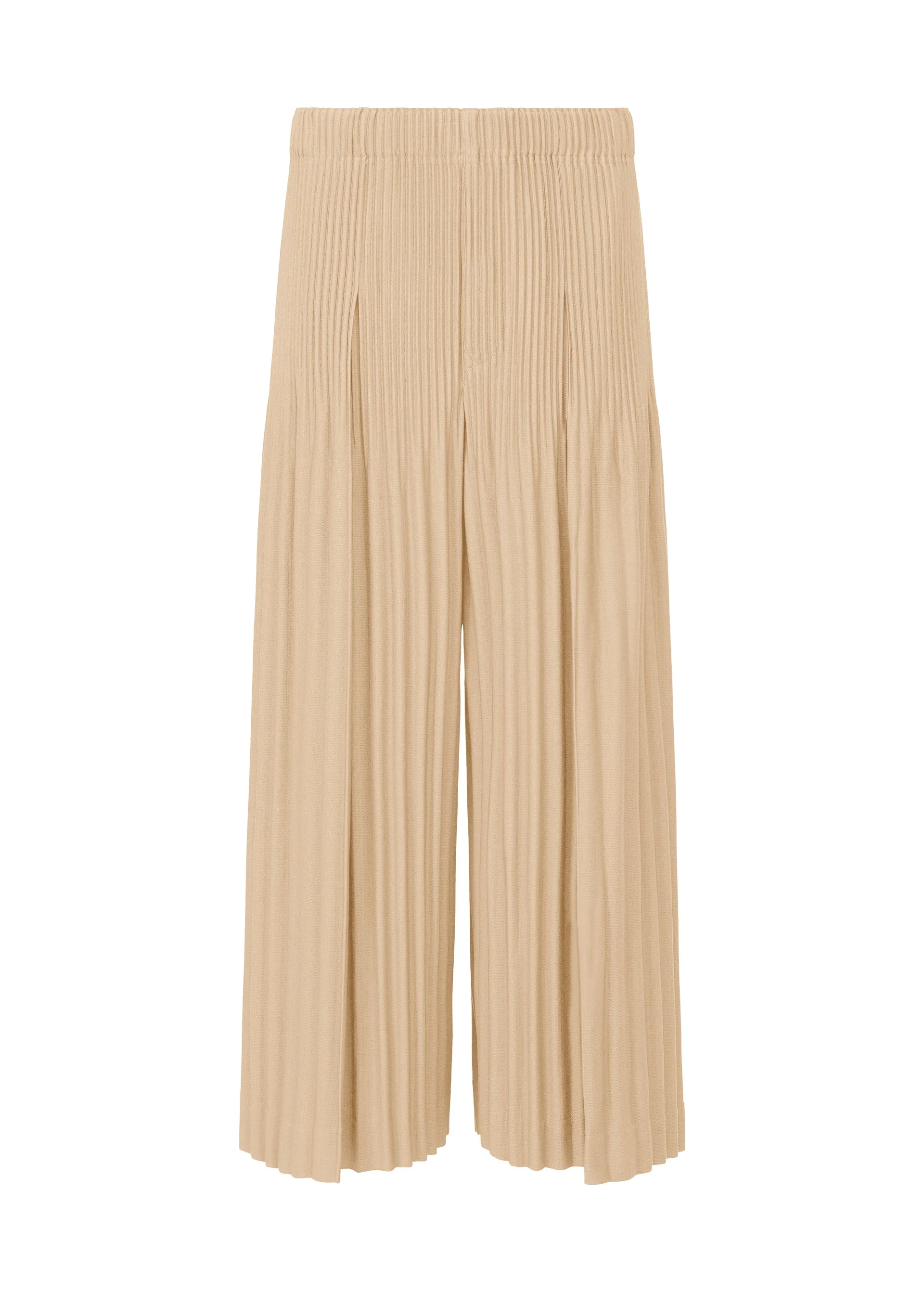 These wide pants available in gentle color tones feature Keshi pleats processing. They are characterized by their portability and light comfort with the unique quick-drying property of polyester material. The relaxed silhouette is reminiscent of Japanese hakama pants. They have pockets on both sides and a draw cord at the waist. They have a button-fly design. Product Information Material: 100% polyester Made in Japan Waist specifications:Elastic / Drawcord Front opening specification:Button fly Pocket (position):Both sides