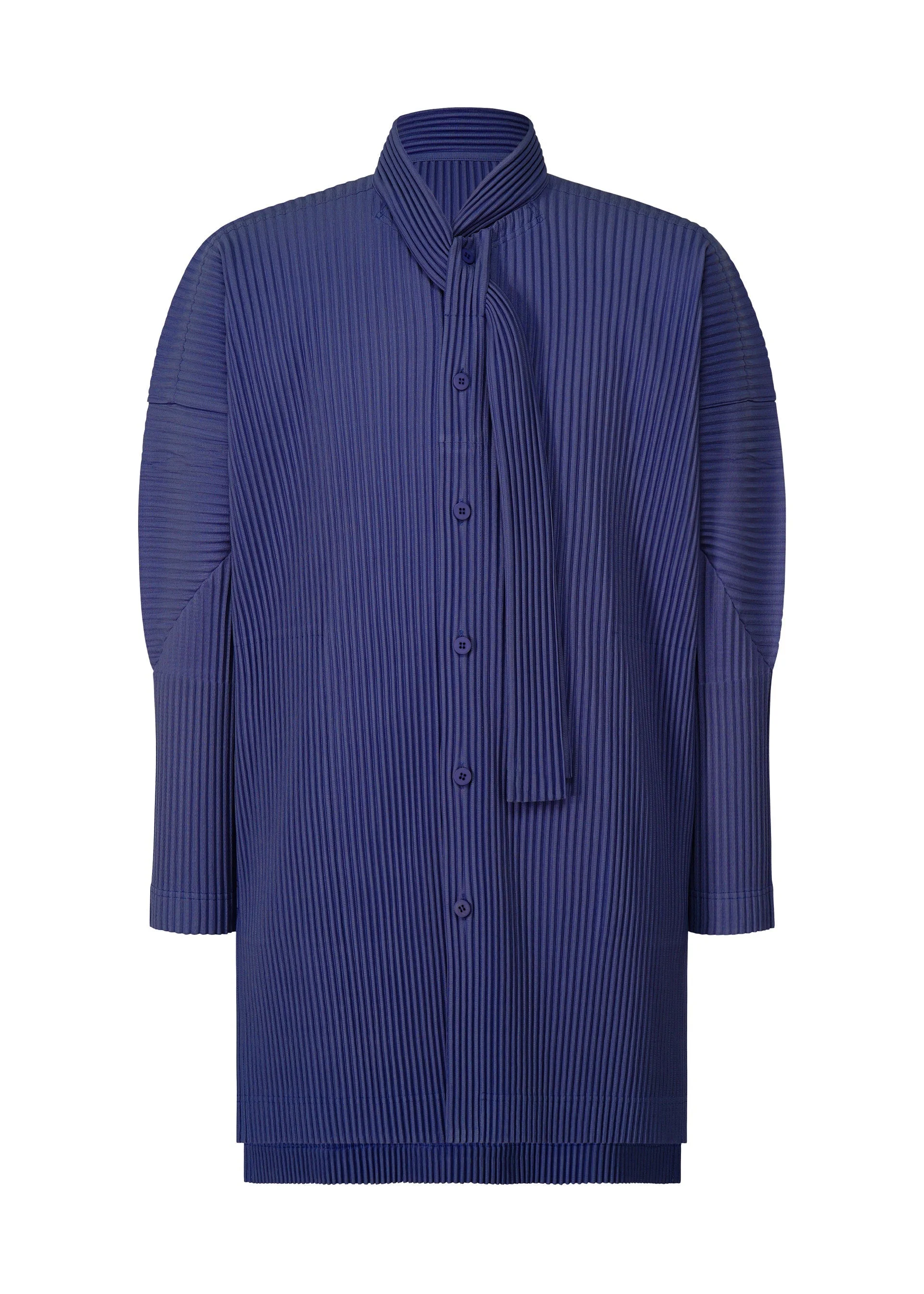 This long-sleeved shirt is available in cool color tones. The neckline is designed like a necktie, allowing you to style it as you like, including by leaving it hanging or tying it. We also recommend it as an inner layer for jacket styles. There are pockets and slits on both sides. Product Information Material: 100% Polyester Made In Japan Neckline / collar:Tie collar Front opening:Button Pocket (position):Both sides Slit (position):Both sides