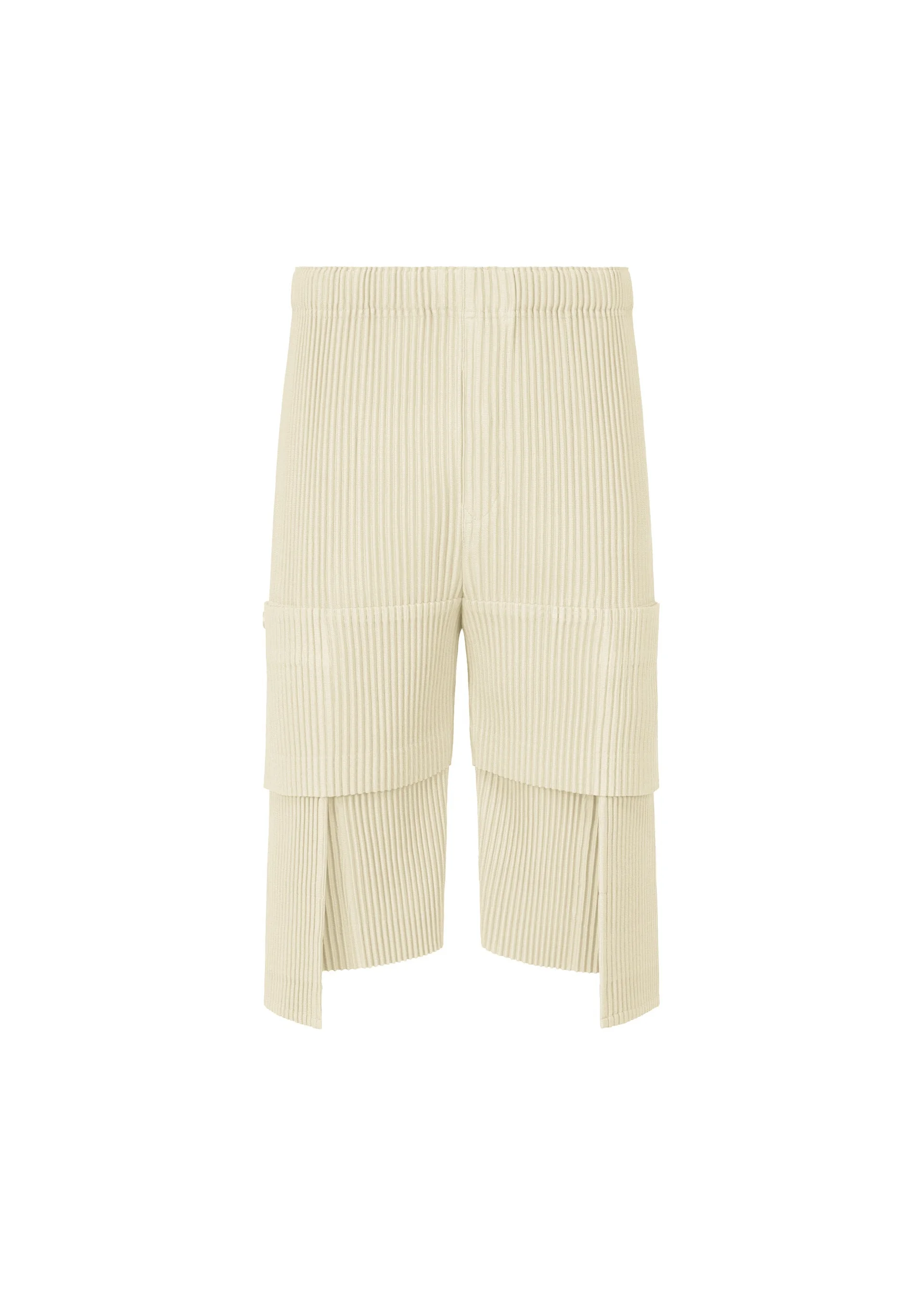 These shorts are characterized by their unique silhouette inspired by the way a pocket expands when a stone is placed inside. When items are placed in the pockets, the pleats expand, which changes the silhouette. The shorts have pockets on both sides and a draw cord at the waist. They have a button-fly design. Product Information Material: 100% polyester Made in the Philippines Waist specifications:Elastic / Drawcord Front opening specification:Button fly Pocket (position):Both sides