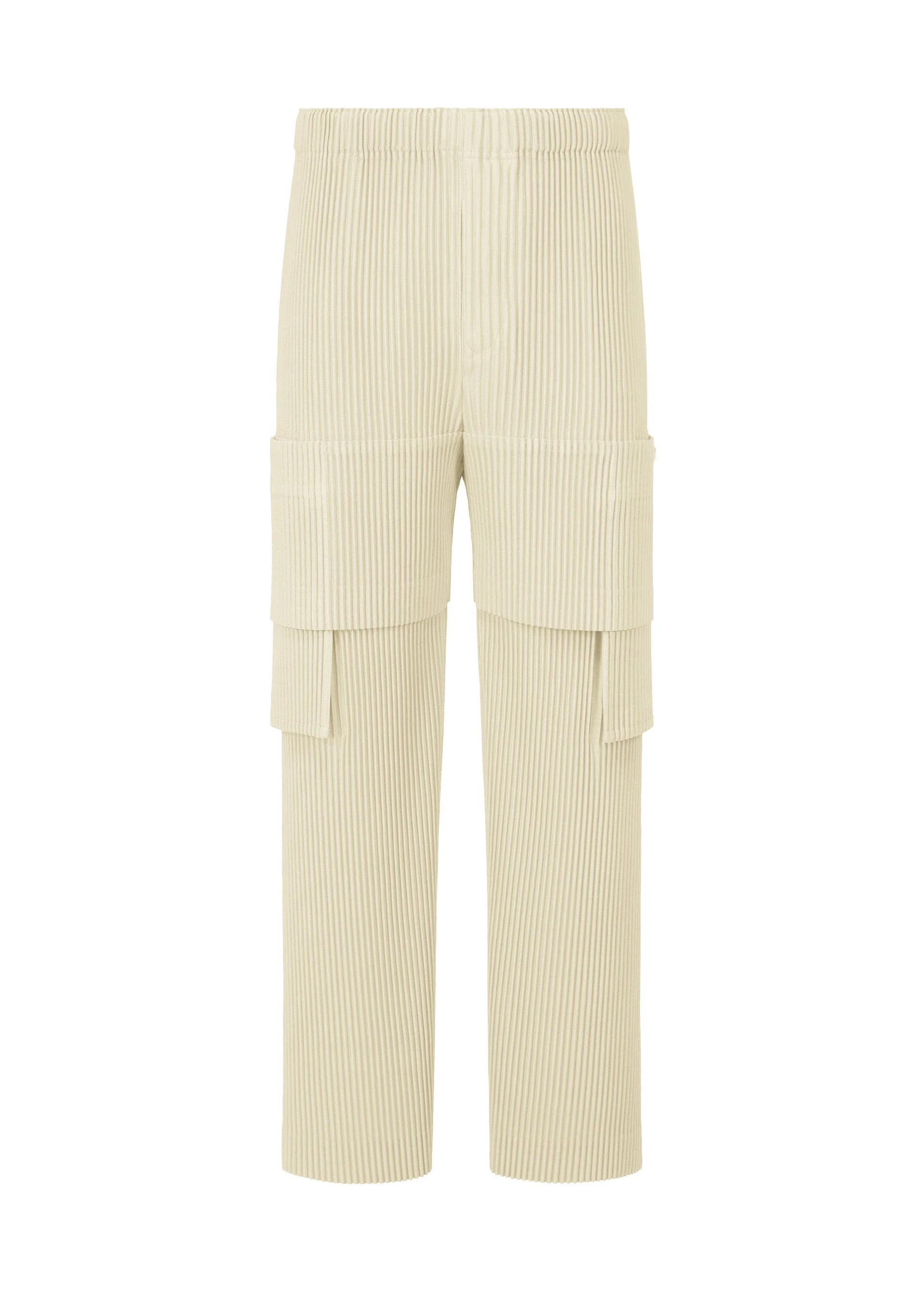 These straight pants are characterized by their unique silhouette inspired by the way a pocket expands when a stone is placed inside. When items are placed in the pockets, the pleats expand, which changes the silhouette. The pants have pockets on both sides and a draw cord at the waist. They have a button-fly design. Product Information Material: 100% polyester Made in the Philippines Waist specifications:Elastic / Drawcord Front opening specification:Button fly Pocket (position):Both sides