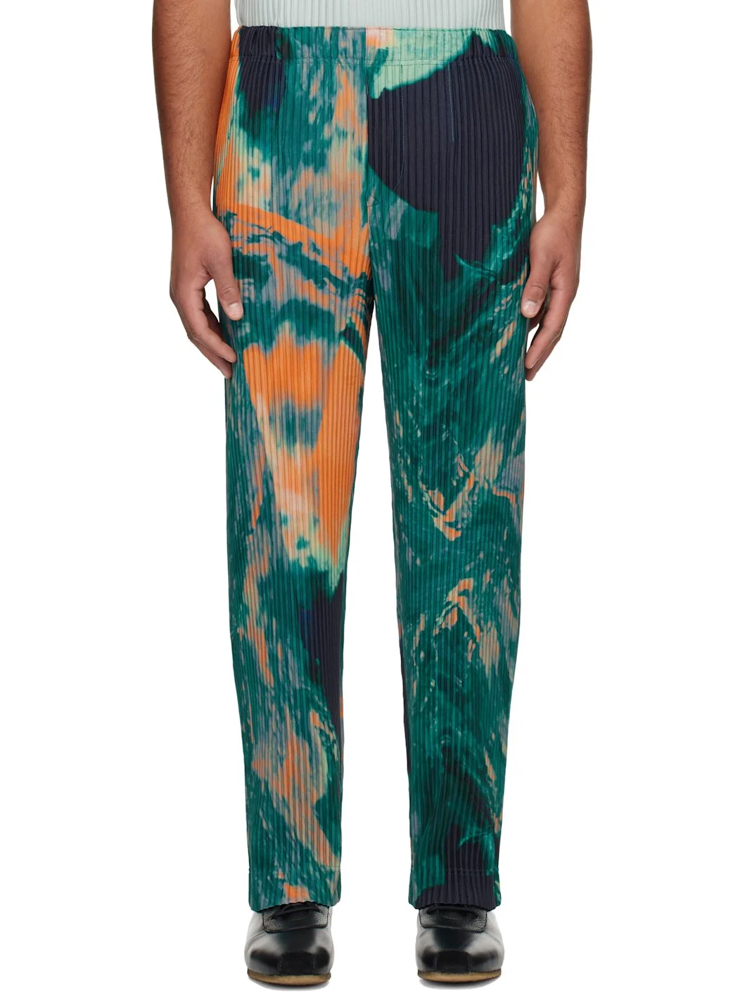 Garment-pleated polyester tricot trousers. · Graphic pattern printed throughout · Straight-leg · Concealed drawstring at elasticized waistband · Two-pocket styling · Button fly Supplier color: Green 100% polyester. Made in Philippines 252729M191070