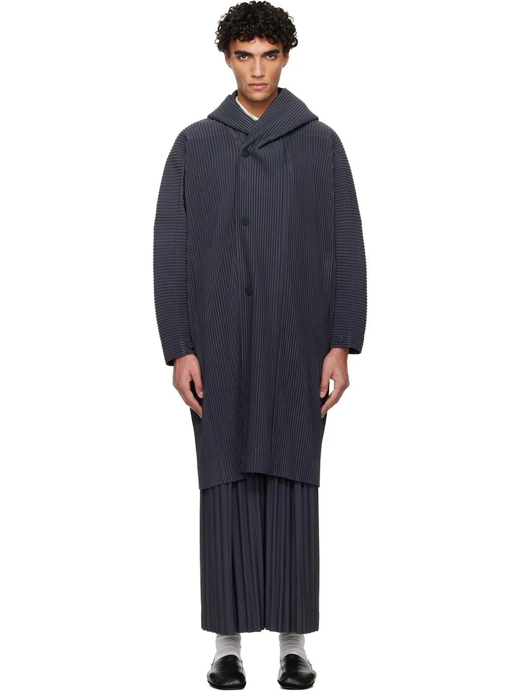 Garment-pleated tricot coat. · Integrated hood at shawl collar · Offset button closure · Seam pockets at waist · Dolman sleeves · Adjustable button fastening at cuffs Supplier color: Septarian Blue 100% polyester. Made in Japan 261729M176002