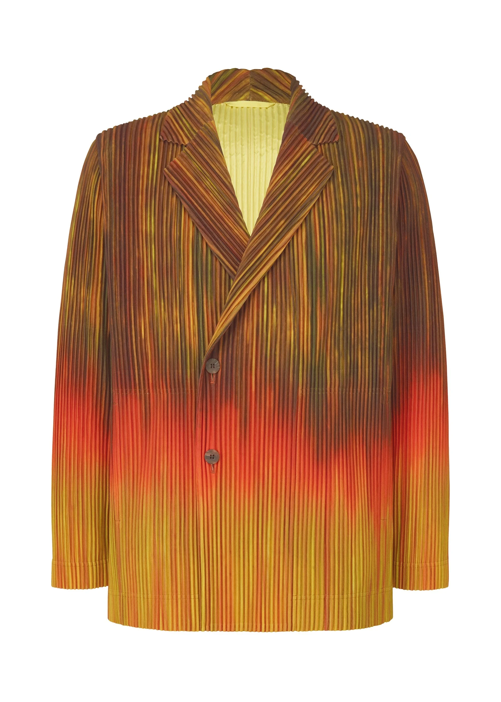 This double-breasted jacket is made from fabric that incorporates a pattern depicting layers of paint that gradually accumulate on the tip of a brush as it picks up colors. The jacket’s gradation recreates the natural transition of color that appears from the brush’s bristles to its base during color blending. The design evokes a three-dimensional sense of color layers and depth. There are pockets on both sides and inside, as well as side vents. Product Information Material: 100% Polyester, Lining: 100% Polyester Made In The Philippines Neckline / collar:Tailored collar Front opening:Double button Pocket (position):Both sides Vent (location):Side vents Others:Inner pockets (both chests) collar strap