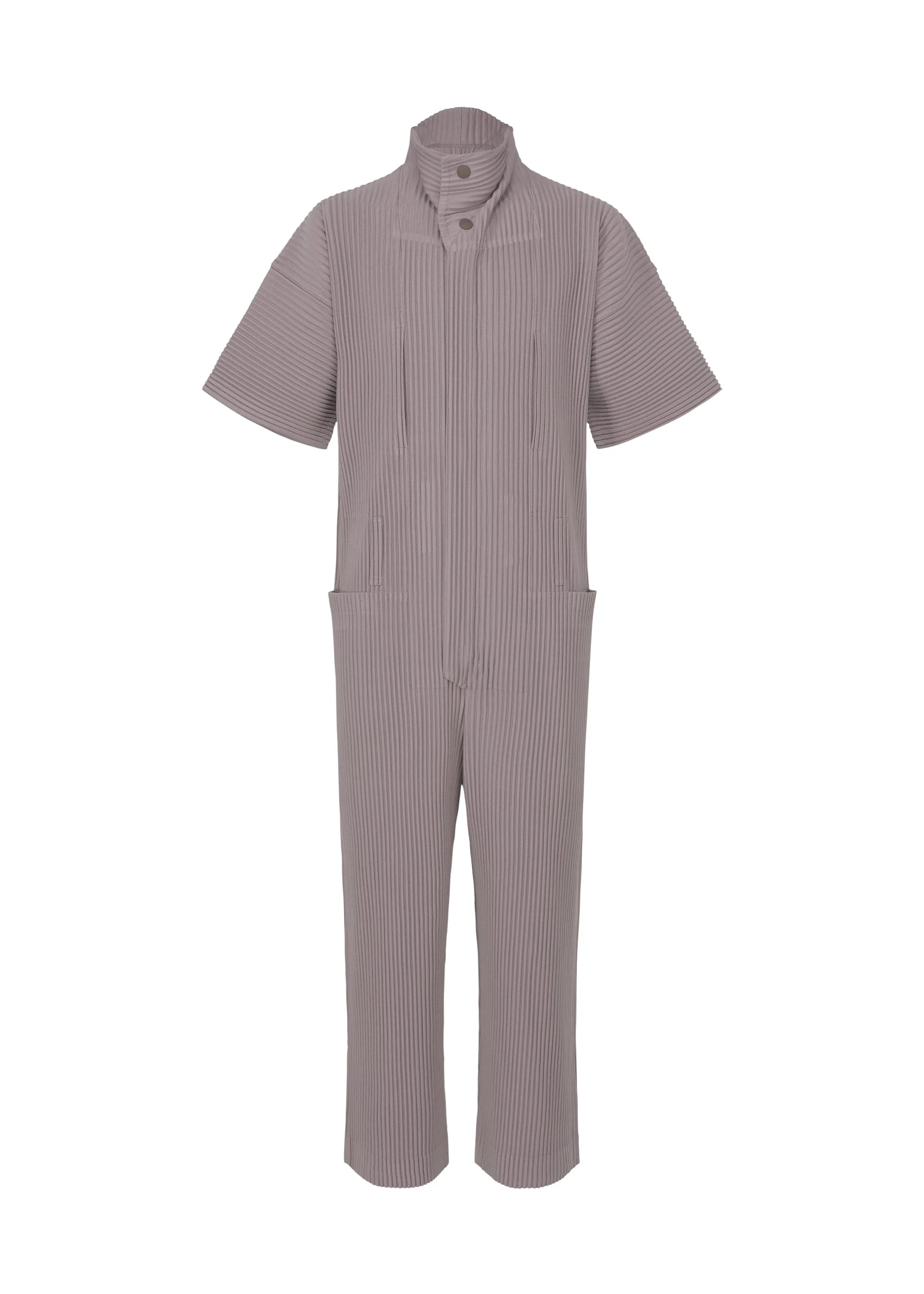 This jumpsuit is available in subdued color tones. You can enjoy the comfortable feel unique to pleated material. It has pockets on both sides, chest pockets on both sides, and belt loops at the waist. It has a zipper-fly design. Product Information Material: 100% polyester Made in the Philippines Neckline / Collar:High neck Front opening:Button / Double Zip Pocket (position):Both breasts / both sides Waist specifications:belt loop