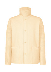 This knit jacket is characterized by its varied silhouette combining standard knitted fabric and ribbing. It has pockets on both sides.