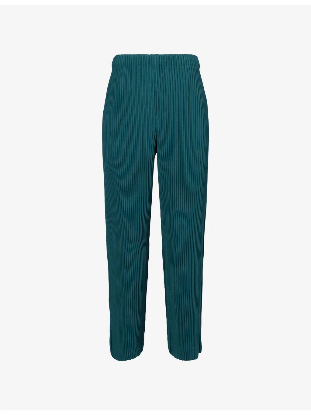 PRODUCT DETAILS - Homme Plisse Issey Miyake knitted trousers - 100% polyester - Regular fit, mid-rise, straight leg, elasticated waistband, concealed button fly, slip pockets at front, all-over pleated - Machine wash at 30°C - Made in Japan - Model is 6ft 2in/1.88m and wears a size 3 - Lightweight, stretchy Ref: R04588767