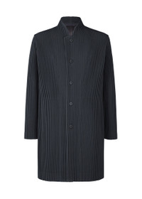 This long jacket with a stand collar has a simple design. It has thin padding on the shoulders and can be worn in a wide range of situations, from formal to casual. It has pockets on both sides, inner pockets, and a back center vent.