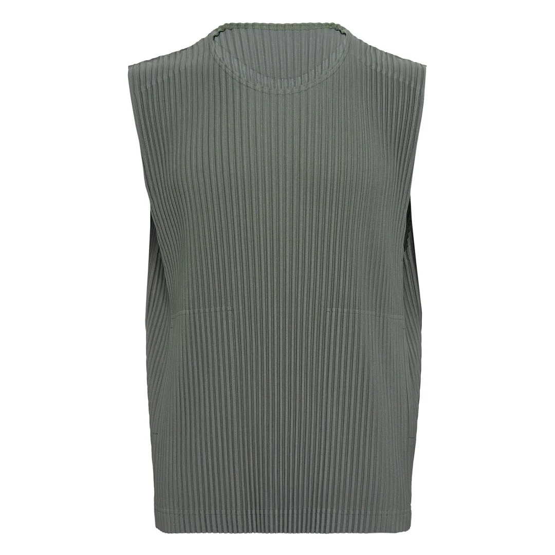 600069318GRN002 / HP58JE157/00/64/DEC - Signature PLEATS PLEASE pleating technology - Crew neckline - Sleeveless design - Structured micro-pleated fabric - Machine washable pleated construction - Relaxed fit HOMME PLISSE ISSEY MIYAKE Tailored Pleats Vest delivers architectural design with innovative pleating technology. Crafted from signature pleated fabric in sophisticated sage green, featuring the brand's revolutionary garment pleating technique for structure and comfort. The sleeveless silhouette and micro-pleated texture create a contemporary statement piece with Japanese minimalist aesthetic.