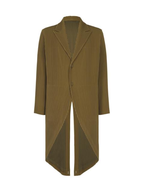 This long jacket has a luxurious feel suitable even for formal occasions. It is made from material that is more flowy than conventional pleated materials. It has buttons on the back, sleeves, and hem, allowing you to enjoy various silhouette changes depending on how you fasten the buttons. It has pockets on both sides and inside, and a center vent at the back. Product Information Material: 100% Polyester, Lining: 100% Polyester Made In The Philippines Neckline / collar:Tailored collar Front opening:Button Pocket (position):Both sides Vent (location):Center vent Others:Inner pockets (both chests), buttons (back), collar strap