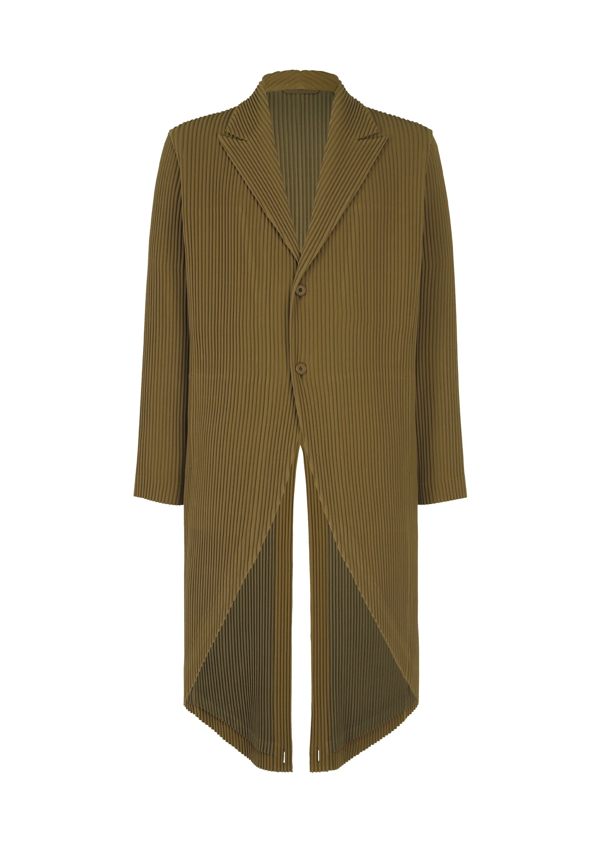 This long jacket has a luxurious feel suitable even for formal occasions. It is made from material that is more flowy than conventional pleated materials. It has buttons on the back, sleeves, and hem, allowing you to enjoy various silhouette changes depending on how you fasten the buttons. It has pockets on both sides and inside, and a center vent at the back. Product Information Material: 100% Polyester, Lining: 100% Polyester Made In The Philippines Neckline / collar:Tailored collar Front opening:Button Pocket (position):Both sides Vent (location):Center vent Others:Inner pockets (both chests), buttons (back), collar strap