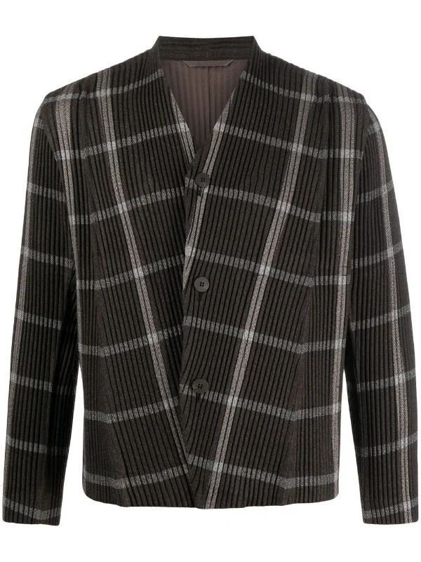Tweed Pleats Jacket in Black Check from Homme Plisse Issey Miyake Highlights - black - grey checks - full plisse - v-neck - front button closure - long sleeves - straight hem Composition: 100% Polyester Designer ID: HP28FD305 Color ID: 19 Materials 100% Polyester