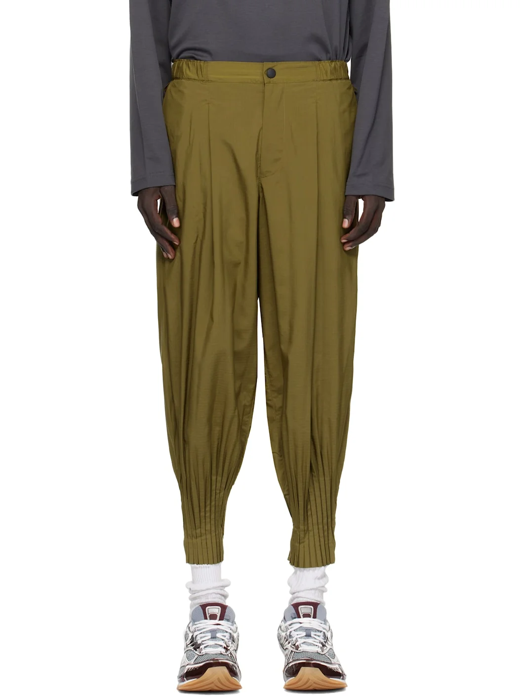 Technical ripstop trousers. · Tapered · Concealed drawstring at elasticized waistband · Four-pocket styling · Zip fly · Pleats at front and back waist · Accordion pleats at cuffs · Loops at back waist Supplier color: Khaki 100% polyester. Made in Philippines 252729M191003