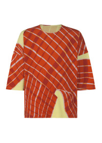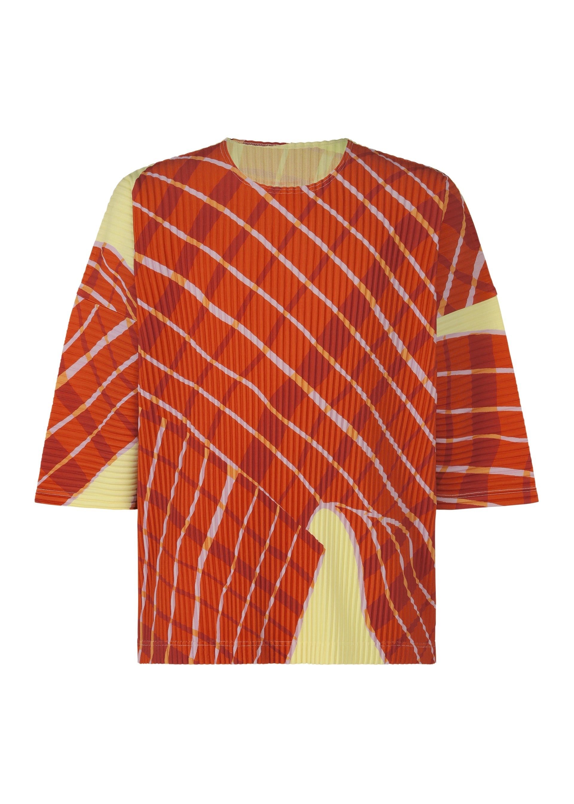 This round-neck, short-sleeved top has an impressive pattern composed by capturing the moment when the plaid-patterned fabric flutters in the wind. It expresses the fun, wonder, and spontaneity of the plaid pattern being naturally distorted by the force of the wind. Product Information Material: 100% polyester Country of origin: Japan neckline/collar:round neck