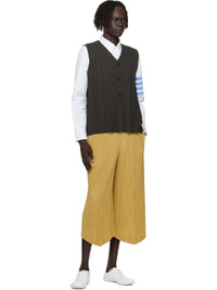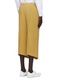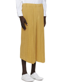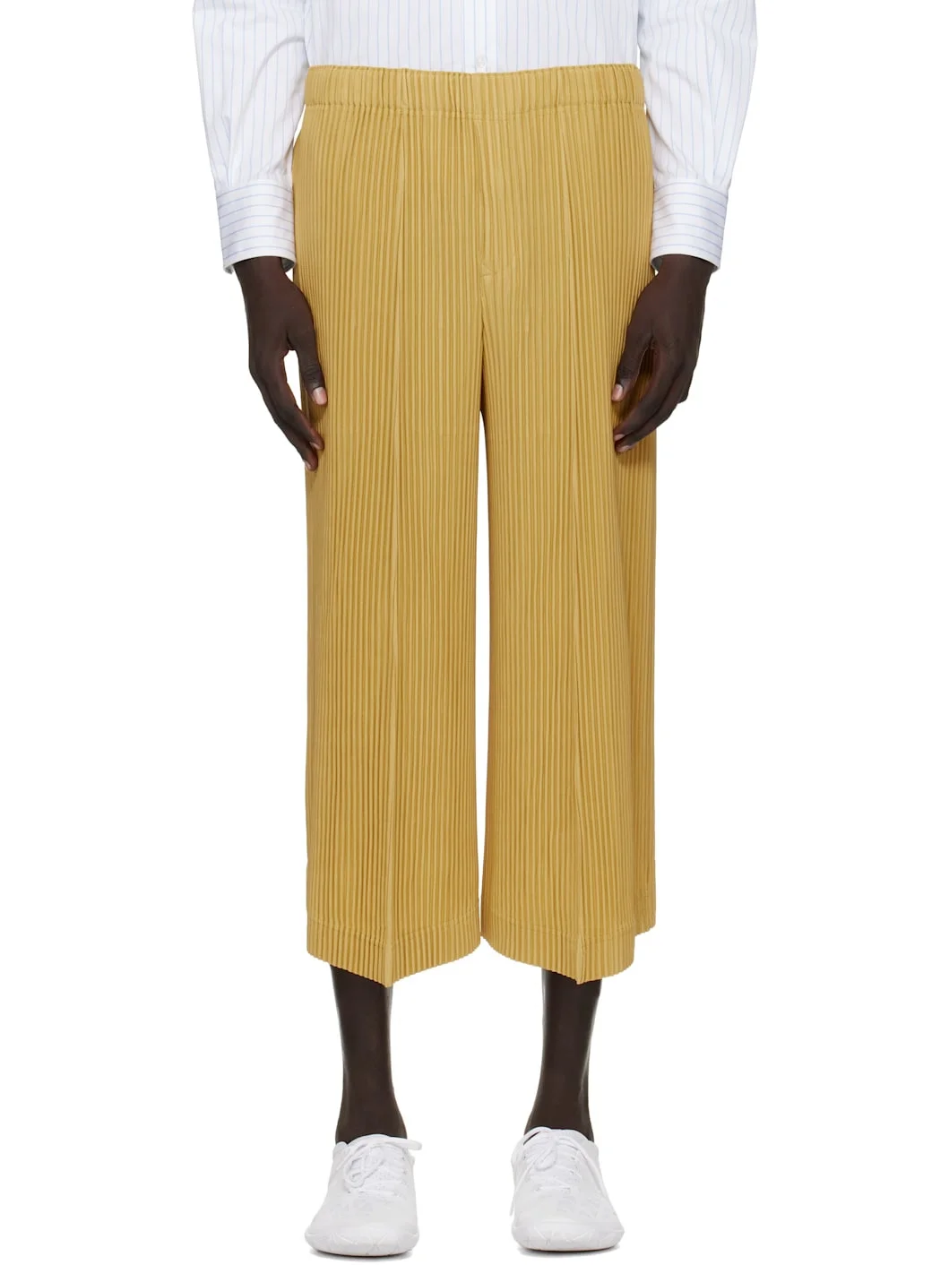 Garment-pleated tricot trousers. · Quick-drying · Concealed drawstring at elasticized waistband · Two-pocket styling · Button fly · Crease at front and back legs · Cropped leg · Vent at back cuffs Supplier color: Wall yellow 100% polyester. Made in Japan 252729M191013