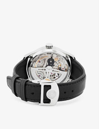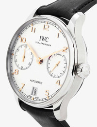 PRODUCT DETAILS - IWC Schaffhausen stainless-steel and leather automatic watch - 100% stainless steel; strap 100% leather - Style number: IW500704 - Buckle fastening - Round dial, sapphire convex antireflective glass case, branded face, date display window at 6 o’clock, rotor with 18ct rose gold medallion, power reserve display window at 9 o’clock, 168 hours power reserve, frequency 28800.0vph, 257 components, 31 jewels, pellaton automatic winding, small hacking seconds, automatic, 52010 calibre, see-through sapphier glass back, smooth leather strap, silver-toned buckle - Case diameter: 42.3 mm - Wipe with a clean, dry cloth - Water resistance: 3 bar / 3 atm / 30 m / 100 ft - Made in Switzerland - Two-year international limited warranty