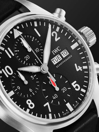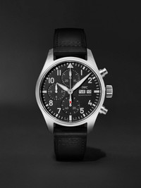IWC SCHAFFHAUSEN's long history of crafting aviation watches began in the mid-1930s – today its 'Pilots' references rank among the brand's most popular and recognisable designs. Inspired by cockpit instruments, this stainless steel reference is powered by an in-house 69385 automatic chronograph movement that's visible through the exhibition case back. It has an eye-catching fumé dial featuring a day and date window and is set on a dark-brown leather strap, which can be easily swapped out using the integrated EasX-CHANGE® system. For warranty information, please refer to details & care Details & Care Movement - Swiss-made calibre 69385 automatic chronograph movement with 46-hour power reserve - 33 jewels, 28,800 Vph Functions - Hour, minute and small hacking seconds hands - Date and day windows - Chronograph: 60-second, 30-minute and 12-hour counters Dial - Navy and black dial - Rhodium-plated hands, luminous stainless steel hands, white Arabic numerals, indices and markers - Case - Stainless steel case - Crown for date and time adjustments and manual winding - Sapphire glass crystal - Exhibition case back - Pin buckle-fastening dark-brown leather strap (Calf) Specifications - Case diameter: 41mm; case thickness: 14.5mm; strap width: 20mm - Water resistance: 10 bar - Comes in a presentation box - Reference number: IWIW388111 We offer an eight-year warranty for all working parts and manufacturing faults for IWC watches. For more information, contact one of our experts by emailing watches@mrporter.com
